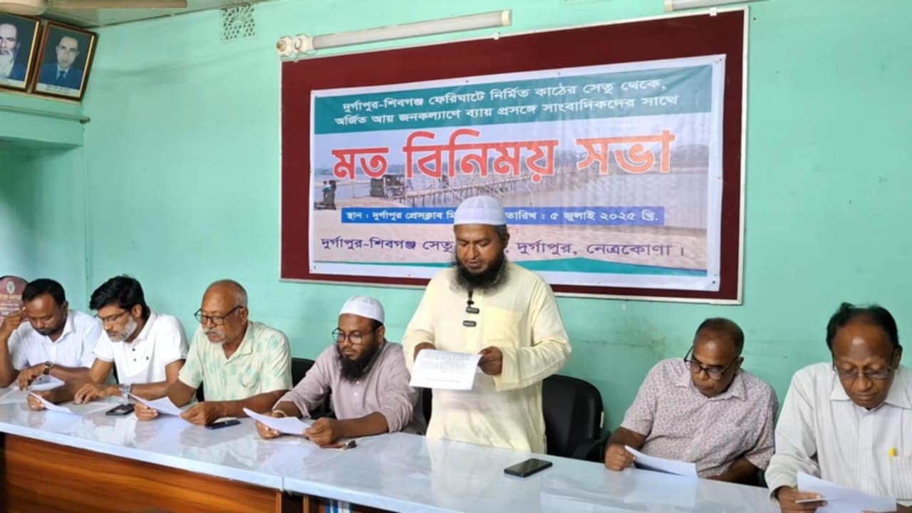 নেত্রকোনার দুর্গাপুর শিবগঞ্জ ফেরিঘাটে নির্মিত কাঠেরz সেতু থেকে অর্জিত আয় জনকল্যাণে ব্যয় বিষয়ে সাংবাদিকদের সাথে মতবিনিময় সভা হয়েছে। শনিবার দুপুরে প্রেসক্লাব মিলনায়তনে সাংবাদিকদের সাথে এ মতবিনিময় করেন দুর্গাপুর-শিবগঞ্জ অস্থায়ী সেতু কমিটি। কমিটির নেতৃবৃন্দ সাংবাদিকদের বলেন, কেন্দ্রীয় বিএনপির আইন বিষয়ক সম্পাদক ব্যারিস্টার কামালের সার্বিক সহযোগিতায়, সোমেশ্বরী নদীর ওপর কাঠ-বাঁশ দিয়ে একটি অস্থায়ী সেতু তৈরী করে ২০২৪ সালের ১৫ই ডিসেম্বর উদ্বোধন করা হয়। সেতুটি নির্মাণে ব্যায় হয় ১৫ লাখ ৪০ হাজার টাকা। এই সেতু থেকে পাঁচ মাসে ৫২ লাখ ৬৭ হাজার ৬৪০ টাকা টোল আদায় করা হয় ।