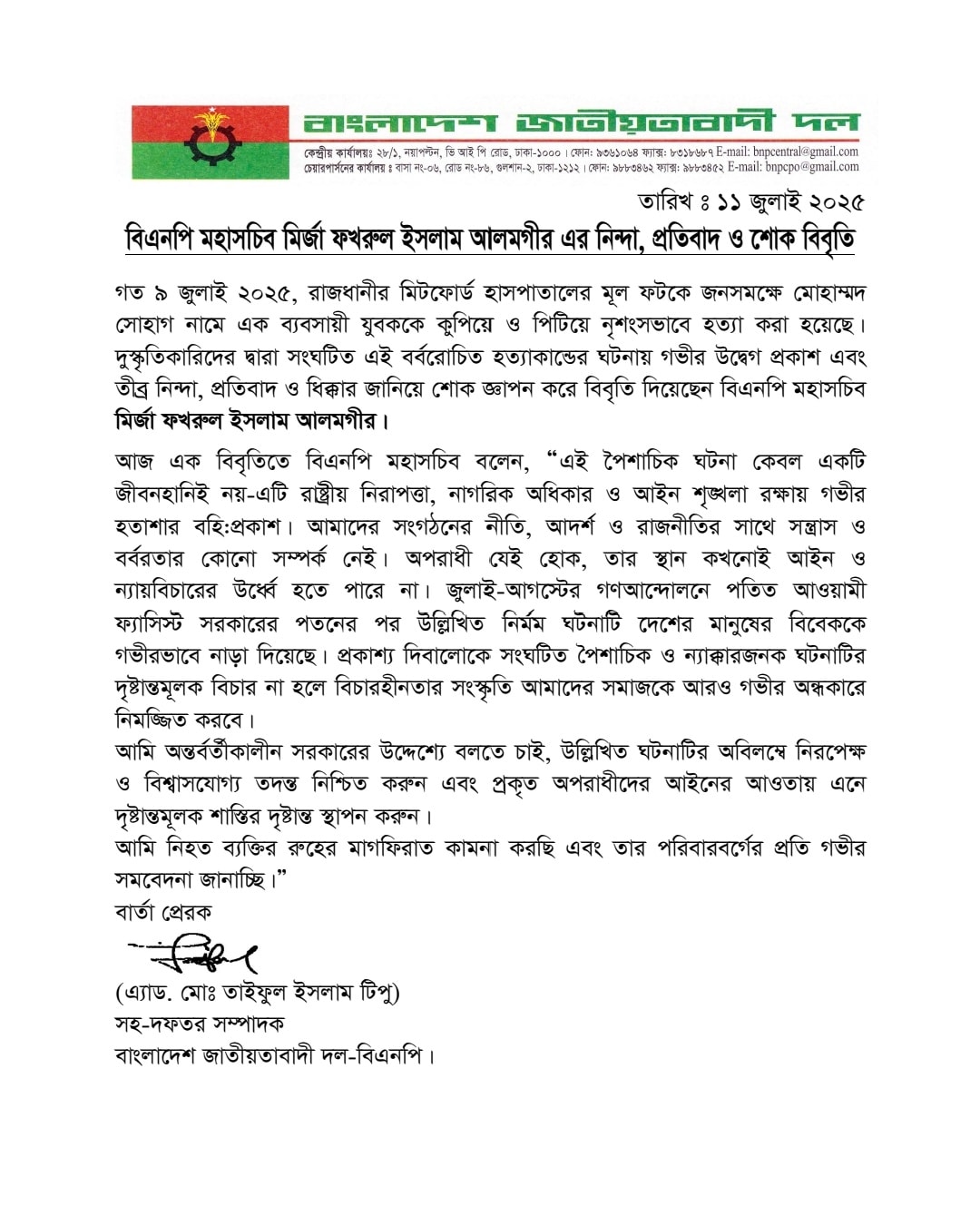 মিটফোর্ডের ঘটনায় জড়িতদের দৃষ্টান্তমূলক শাস্তি চান মির্জা ফখরুল ইসলাম আলমগীর