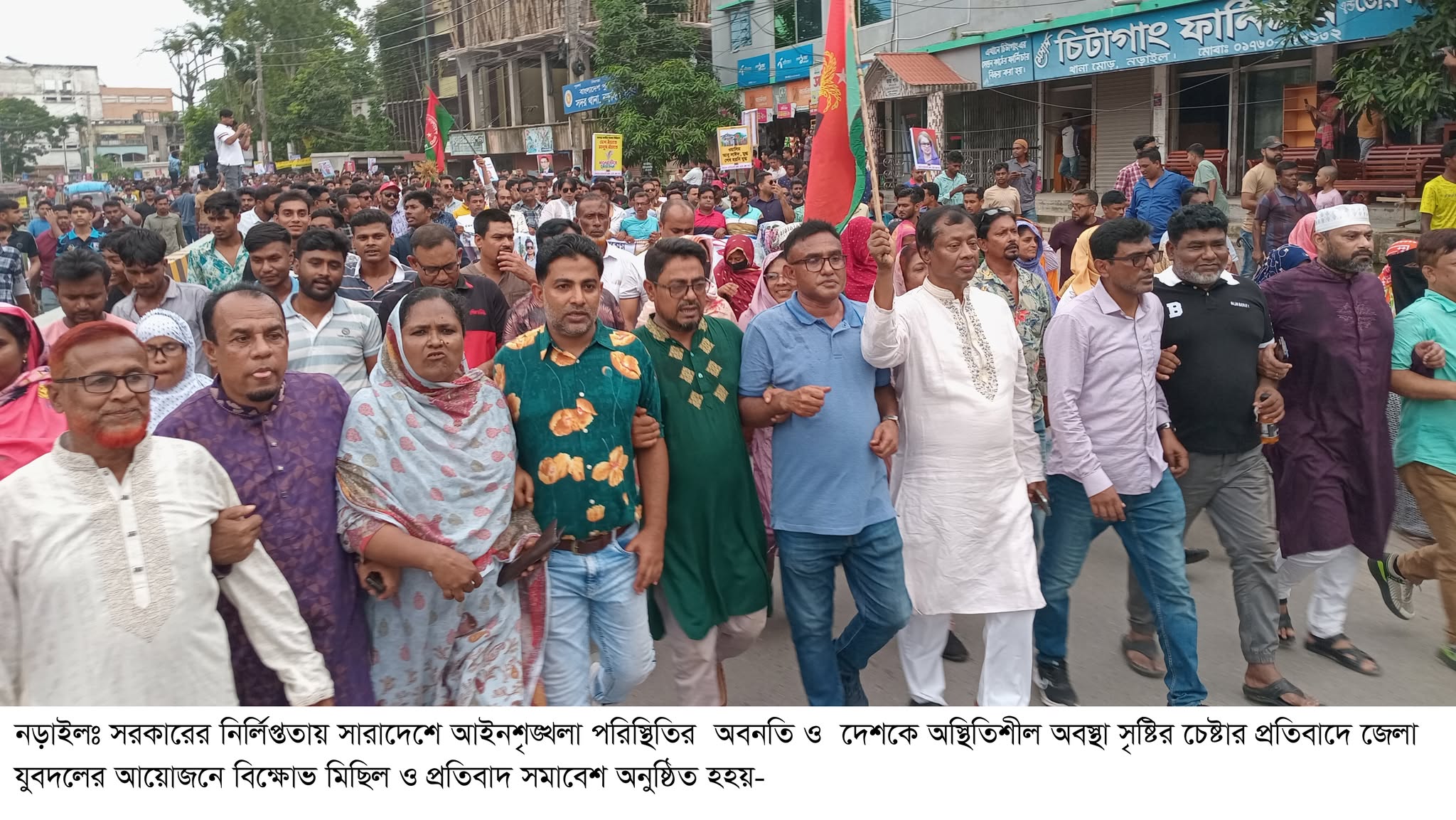 সরকারের নির্লিপ্ততায় সারাদেশে আইনশৃঙ্খলা পরিস্থিতির অবনতি ও দেশকে অস্থিতিশীল অবস্থা সৃষ্টির চেষ্টার প্রতিবাদে নড়াইলে বিক্ষোভ মিছিল ও সমাবেশ অনুষ্ঠিত হয়েছে।