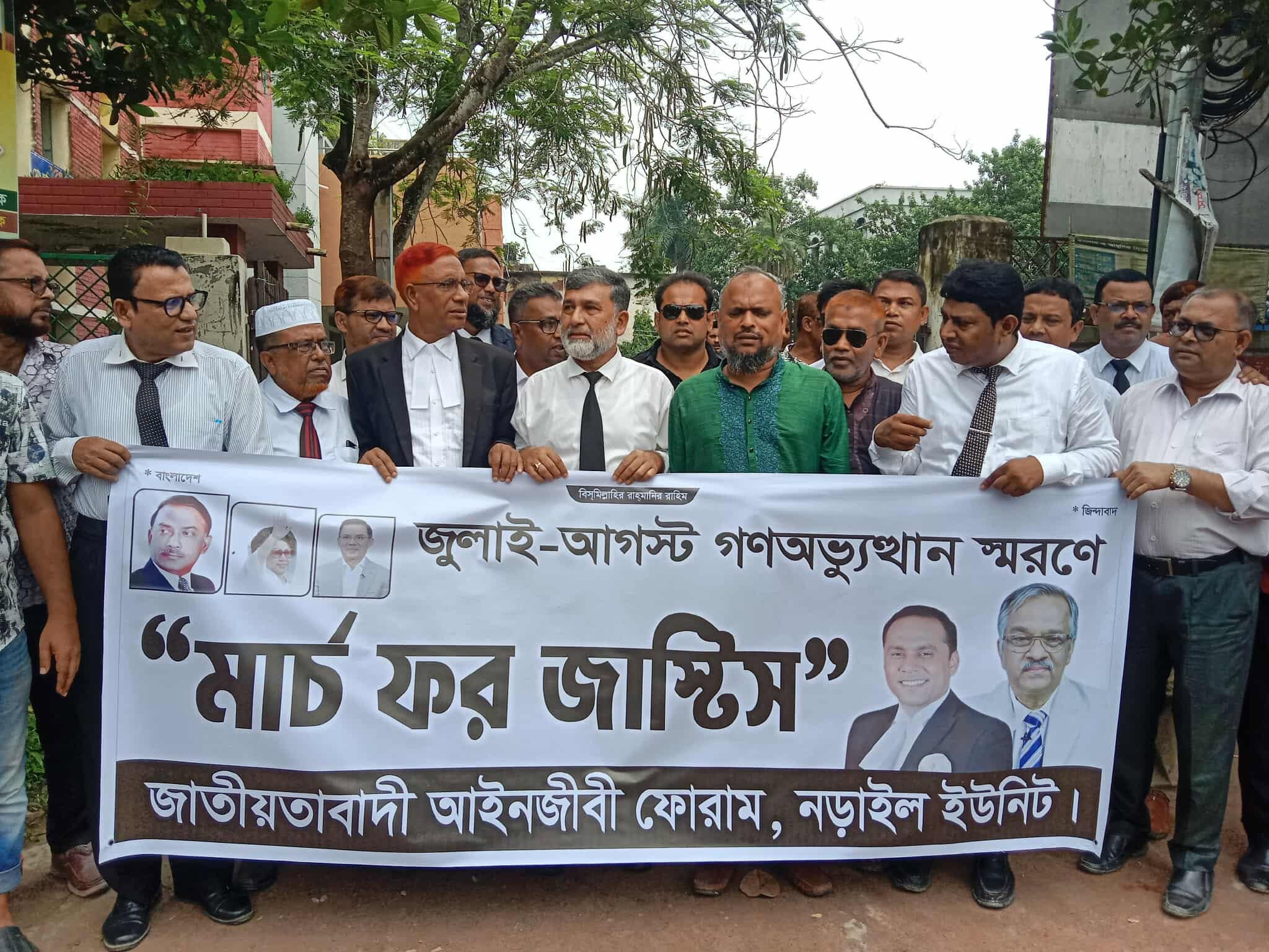 জুলাই –আগস্ট “মার্চ ফর জাস্টিস’ কর্মসূচির অংশ হিসেবে নড়াইলে পদযাত্রা ও সমাবেশ  করেছে জাতীয়তাবাদী আইনজীবি  ফোরাম ।