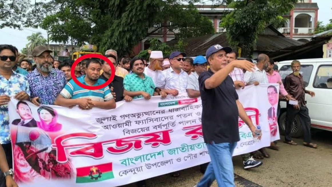 নেত্রকোনার কেন্দুয়ায় ৫ আগস্টের র্যালিতে খোকন আহমেদ নামে একজন পলাতক আসামিকে দেখা গেছে।