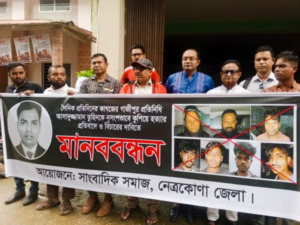 গাজীপুরের দৈনিক প্রতিদিনের কাগজ পত্রিকার প্রতিনিধি আসাদুজ্জামান তুহিনকে নৃশংসভাবে কুপিয়ে হত্যার প্রতিবাদে এবং দোষীদের দ্রুত বিচারের দাবিতে নেত্রকোনায় মানববন্ধন অনুষ্ঠিত হয়েছে।