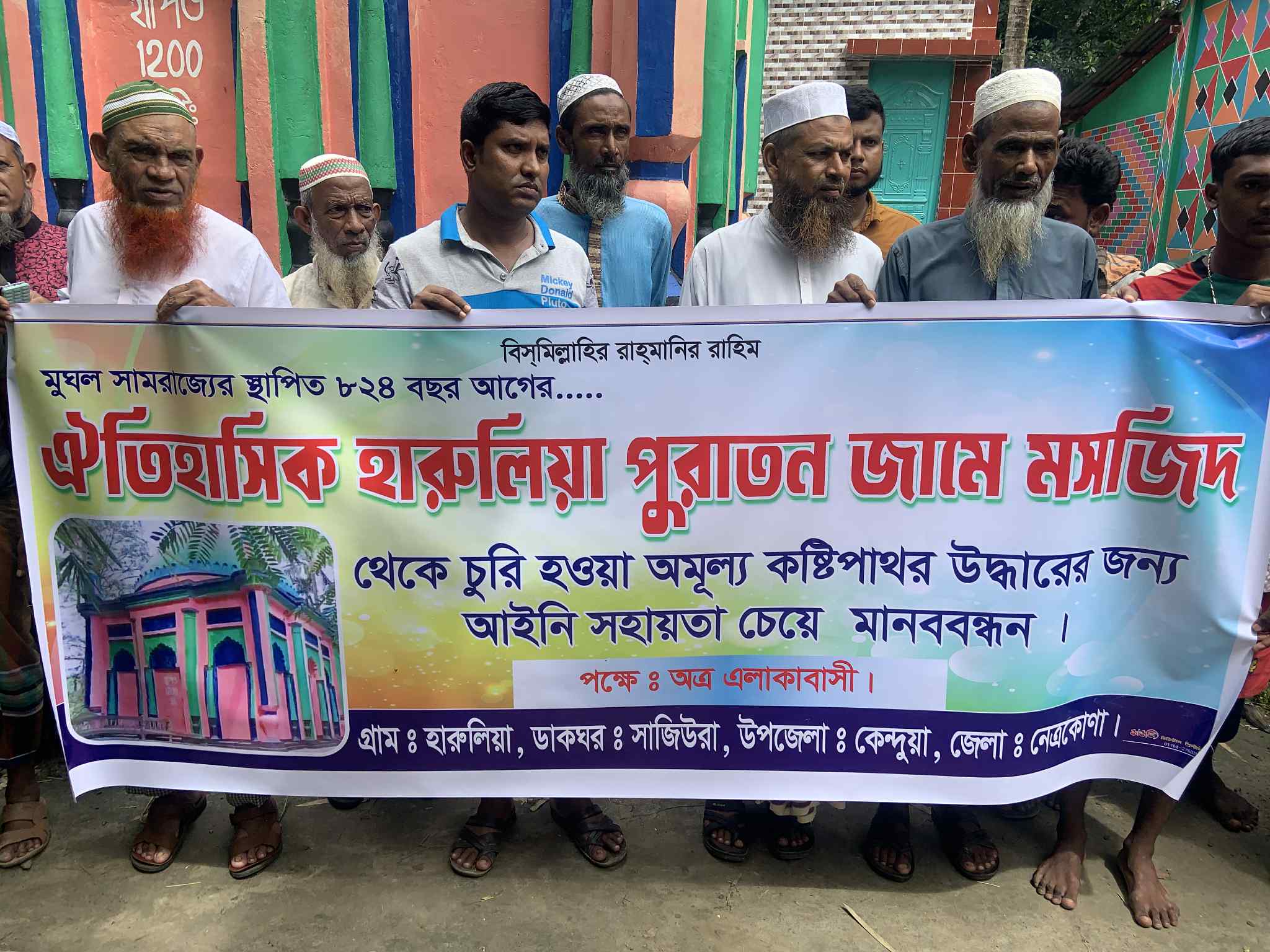 কেন্দুয়ায় হারুলিয়া জামে মসজিদ থেকে চুরি হওয়া কষ্টিপাথর উদ্ধারের দাবিতে মানববন্ধন