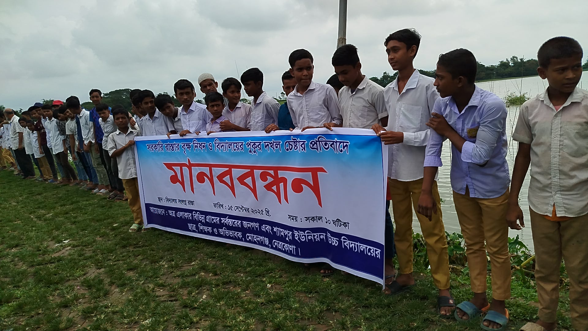 নেত্রকোনার মোহনগঞ্জ উপজেলায় বিদ্যালয়ের জায়গা দখল ও সড়কের গাছ কাটার প্রতিবাদে মানববন্ধন অনুষ্ঠিত হয়েছে।