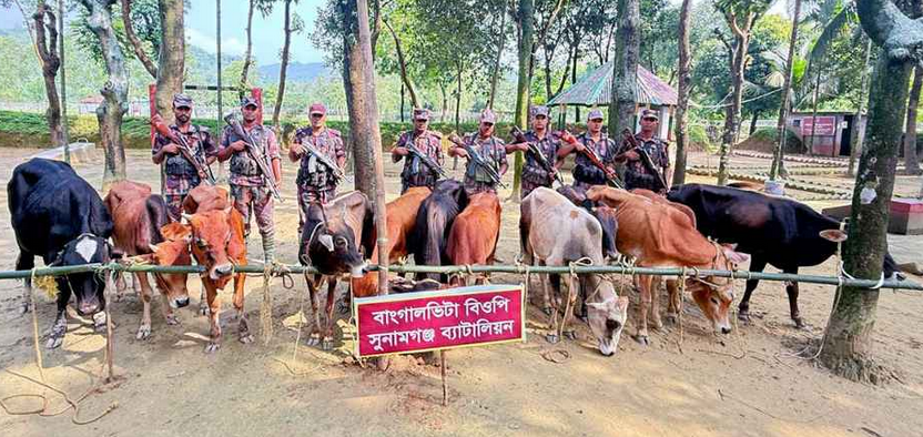 সুনামগঞ্জের মধ্যনগর সীমান্তে অভিযান চালিয়ে ১২টি ভারতীয় গরু আটক করেছে বর্ডার গার্ড বাংলাদেশ (বিজিবি)।
