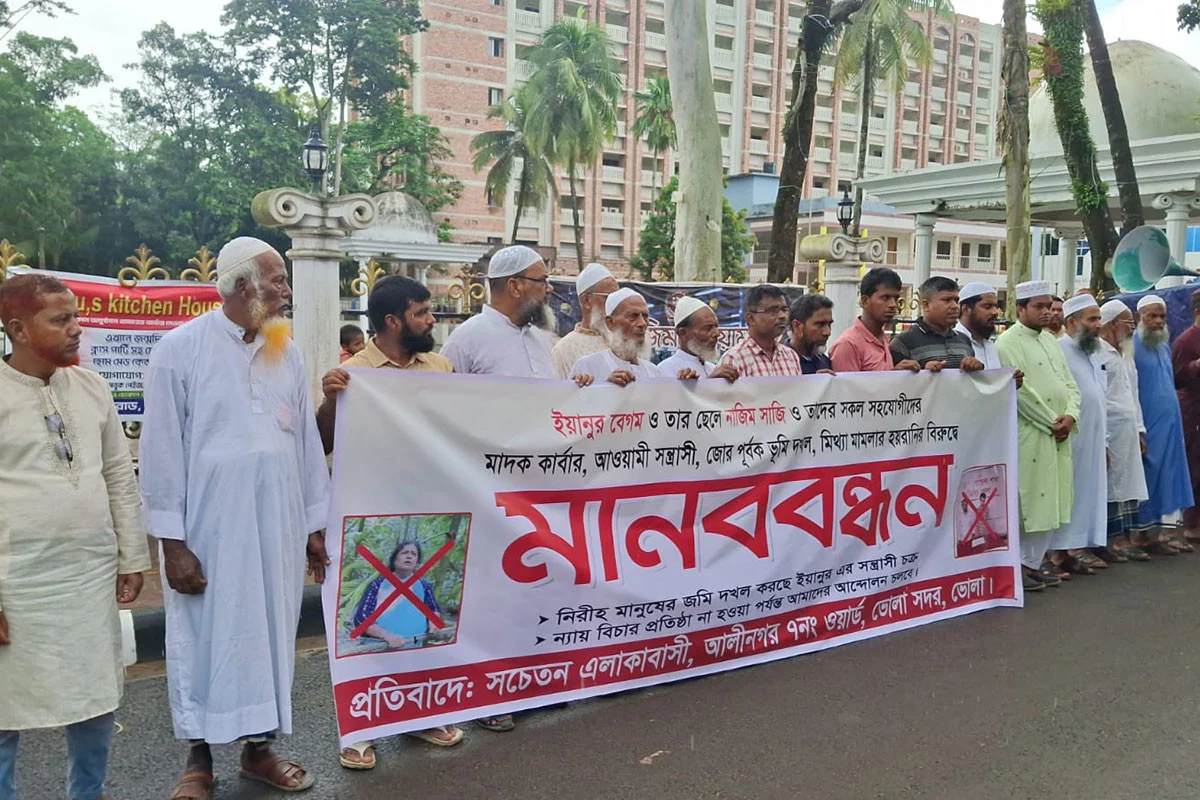 মানববন্ধনে বক্তারা অভিযোগ করেন, স্থানীয় ইয়ানুর বেগম ও তার ছেলে নাজিম সাঝির নেতৃত্বে এলাকায় মাদকের একটি শক্ত ঘাঁটি গড়ে উঠেছে। তাদের বিরুদ্ধে একাধিকবার আইনশৃঙ্খলা বাহিনীর অভিযানে গ্রেফতার হলেও কিছুদিন পর তারা জামিনে মুক্তি পেয়ে পুনরায় একই কাজে জড়িয়ে পড়েন।