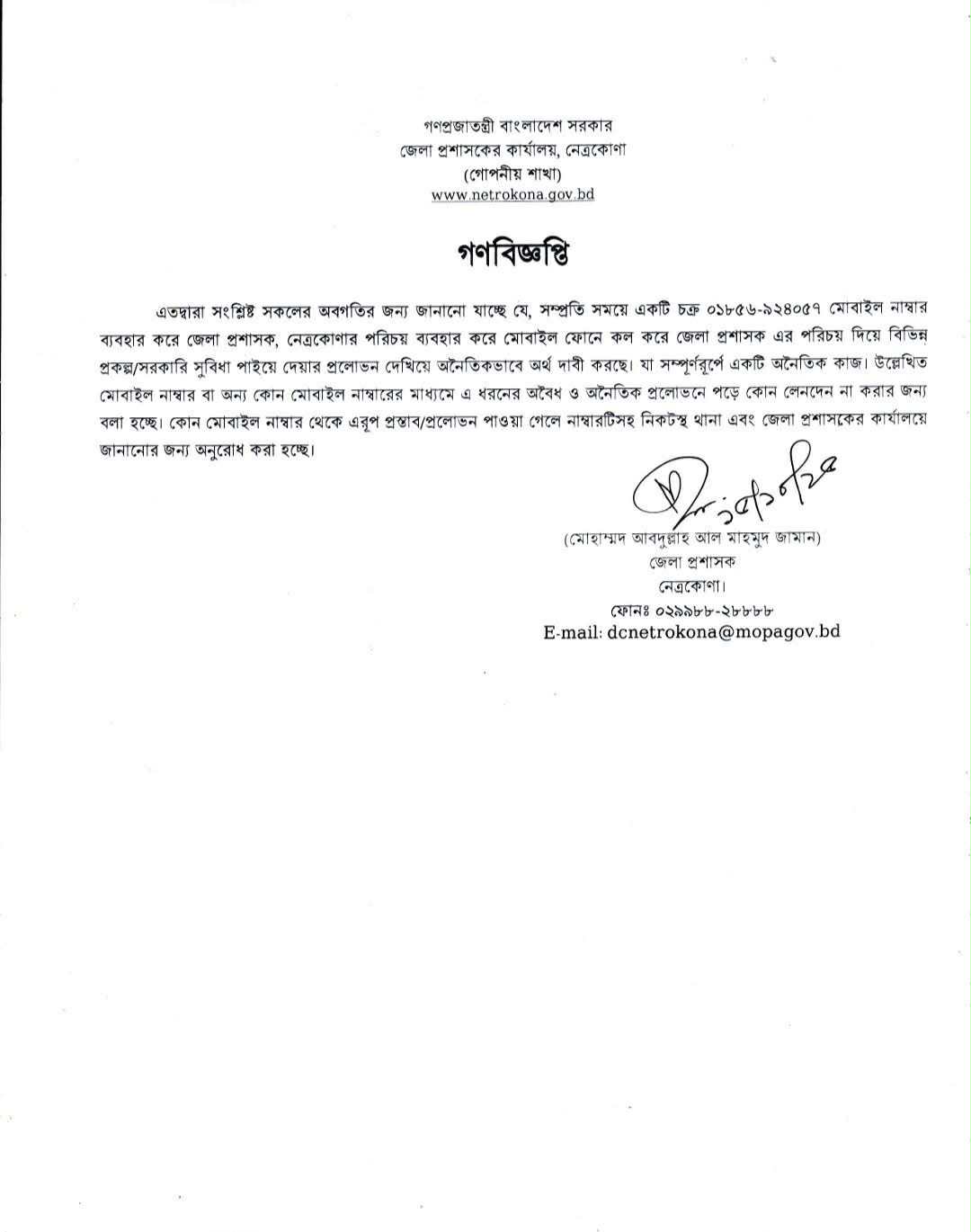 নেত্রকোণায় জেলা প্রশাসকের পরিচয়ে অর্থ আদায়ের চেষ্টা, গণবিজ্ঞপ্তি জারি