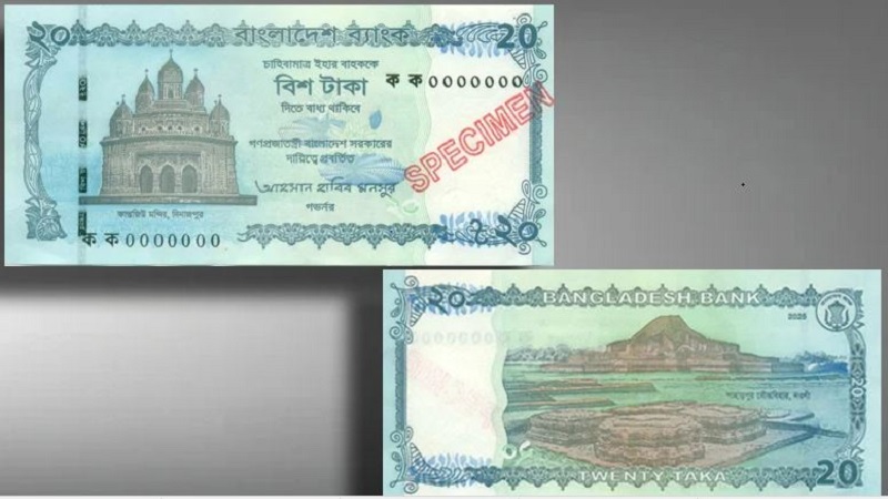২০ টাকার নতুন নোটের সামনের দিকে রয়েছে, দিনাজপুরের ঐতিহাসিক স্থাপত্য কান্তজিউ মন্দিরের ছবি। এ ছাড়া ২০ টাকার নতুন নোটে বাংলাদেশের জাতীয় ফুল শাপলা, পাতা এবং কুঁড়ির ছবি রয়েছে।নোটের পিছনের দিকে রয়েছে পাহাড়পুর বৌদ্ধ বিহারের ছবি। নওগাঁ জেলার এ প্রাচীন স্থাপত্য ইউনেস্কো বিশ্ব ঐতিহ্যবাহী স্থাপনার একটি।