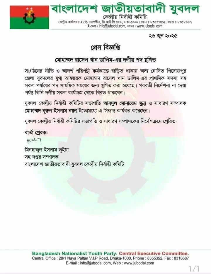 পিরোজপুরে যুব দলের কমিটি ঘোষণার কয়েক ঘন্টা পরে যুগ্ম আহবায়কের পদ স্থগিত